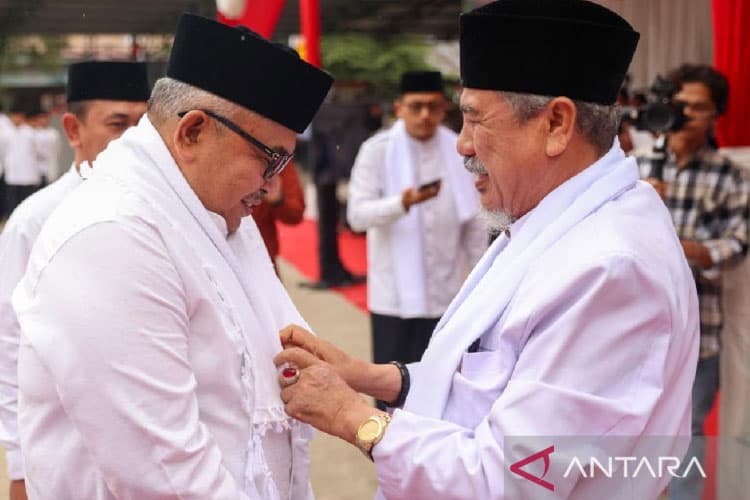 TIMES Serang/Pimpinan pesantren Insafuddin Banda Aceh memberikan kain kepada Sekda Aceh Bustami Hamzah usai peringati Hari Santri, di Banda Aceh, Selasa (24/10/2023). (FOTO: ANTARA/HO/Humas Pemprov Aceh)