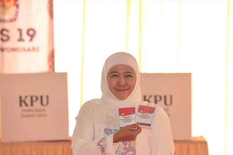 “Alhamdulillah, kami baru saja menyalurkan hak pilih di TPS 19 yang memang adalah TPS yang terdekat dari rumah kami. Saya didampingi Jalal dan juga Ali, sedangkan satu putra saya sedang ada di Inggris karena sedang studi satu lagi hak pilih DKI Jakarta,” tegas Khofifah.