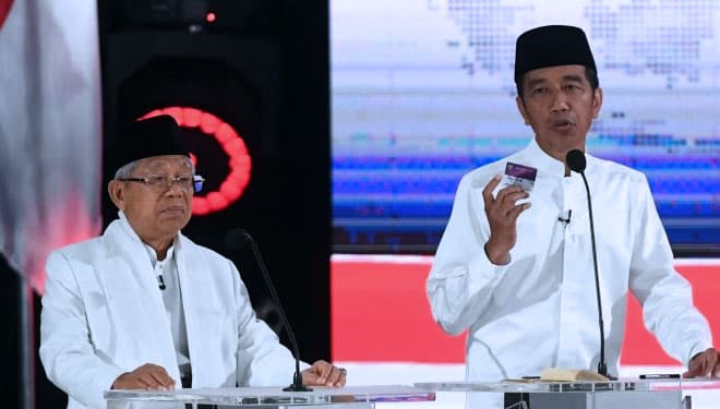 TIMES Serang/Pasangan capres-cawapres nomor urut 01 Joko Widodo (kiri) dan Ma'ruf Amin mengikuti debat kelima di Hotel Sultan, Jakarta, Sabtu (13/4/2019). (FOTO: Wahyu Putro A/Antarafoto)